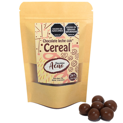 Bolsa por 70 gr de bolitas de cereal de maíz esponjado cubiertas con nuestro delicioso Chocolate leche tipo Suizo al 34% elaborado a partir de cacao Colombiano.