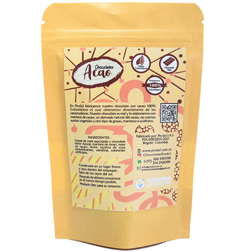 - Chocolate elaborado a partir de cacao 100% Colombiano.
