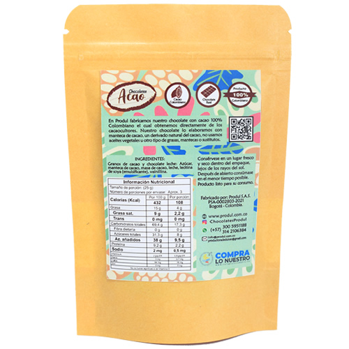 - Chocolate elaborado a partir de cacao 100% Colombiano.