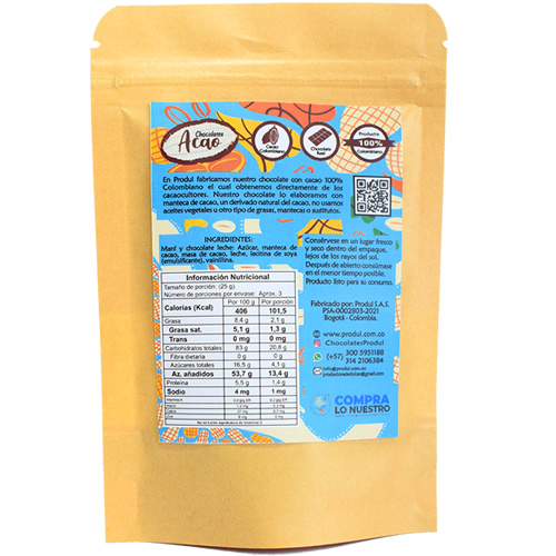 • Chocolate elaborado a partir de cacao 100% Colombiano.