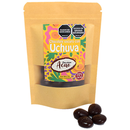 Bolsa por 70 gr de Uchuvas deshidratadas Colombianas tipo exportación, seleccionadas y cubiertas con nuestro delicioso Chocolate oscuro amargo al 70% elaborado a partir de cacao Colombiano.
