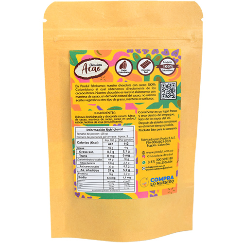 - Chocolate elaborado a partir de cacao 100% Colombiano.